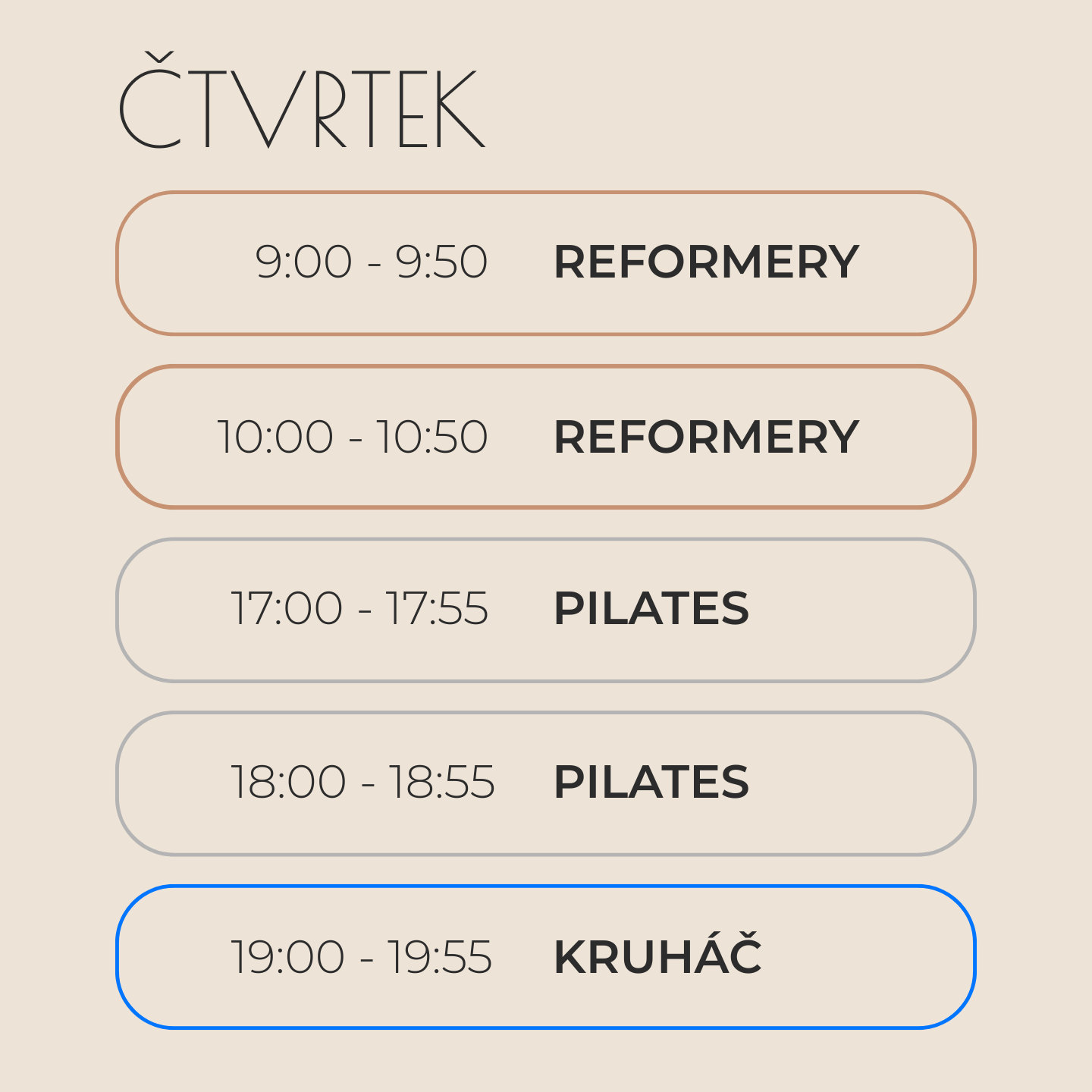 - VHODNÉ PRO: ty, kteří mají s kruhovými tréninky zkušenosti a touží si zaposilovat trošku víc než na klasických lekcích pilates, ale zároveň chtějí dbát na správnou techniku cviků a ostatní benefity, které trénink přináší